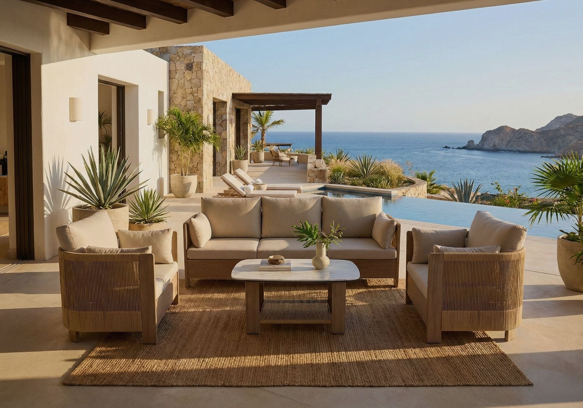 Vida afuera. Muebles de alto rendimiento diseñados para el clima de la costa. Materiales resistentes al sol y la sal que convierten tu patio en una extensión de tu estilo de vida.